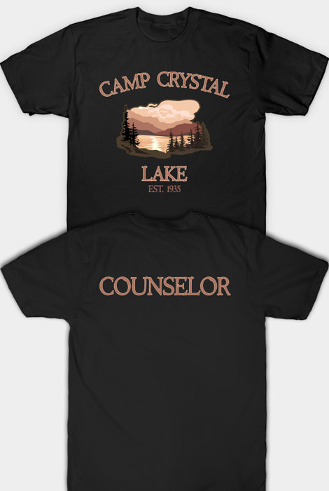 Description: The brown design on these Friday the 13th tees includes the word "Counselor" on the back and the words "Camp Crystal Lake" on the front. Below the lake scene is the text, "Est. 1935". Wear this tee underneath your Jason costume for a killer set of movie related apparel. Buy this together with a Jason Voorhees t-shirt for the perfect Friday the 13th horror combo. Link to: Camp Crystal Lake Friday the 13th
