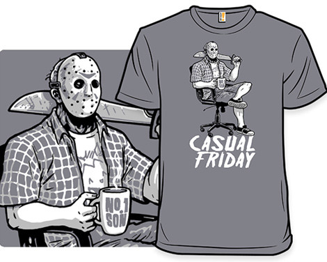 Description: This humorous design features Jason in his hockey mask relaxing on casual Friday. He seems to be in no hurry to instill horror in Crystal Lake's visitors. Wear this Casual Friday the 13th t-shirt to go on your own Crystal Lake weekend getaways. That way, if you run into a hockey masked killer, he might have a good laugh instead of trying to kill you. Link to: Casual Friday the 13th