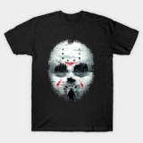 The design on the front of this bestselling Friday the 13th t-shirt features an image of Crystal Lake that as a whole creates Jason's mask. The design displays Jason holding his bloody machete as he stares out at his next victim in a row boat. The moon is casting an eerie light over the water and two cabins can be seen across the lake, which together create the hockey mask's eyes. Wear the tee by itself or with a Jason Voorhees' hockey mask for a fun costume. This Friday the 13th merchandise item is perfect for fans of the classic horror movie. Browse the movie mask in the gallery.