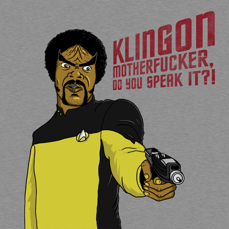 The front of this tee features a play on Jules' "English, do you speak it?!" quote from Pulp Fiction. Instead of English, here, Jules is asking whether you speak the extraterrestrial humanoid language Klingon from
