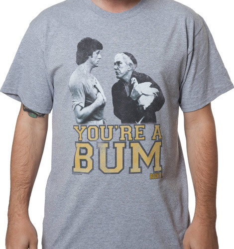 You'll be ready to eat lightning in this Mighty Mick's Gym Rocky t-shirt that declares, "You're a bum." It just might have you uttering a few "Yo, Adrians" once you try it on. The owner of Mick's Gym appears on the front of this tee, along with his undisciplined subject. Mick's Gym is where Rocky Balboa trained under the tutelage of Mickey Goldmill (Burgess Meredith). Eat lightning and crap thunder in this You're a Bum Rocky tee.