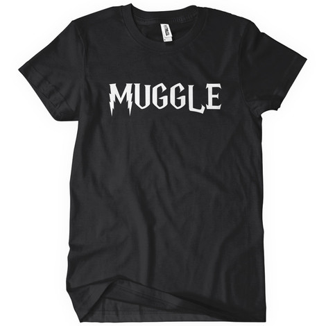 In J. K. Rowling's Harry Potter books, Muggle is the term used to refer to a human who does not have magical abilities. This Muggle t-shirt displays the word 'MUGGLE' proudly on the front. In the books, some of the most notable Muggles are Hermione Granger's parents. The derogatory term for a child like Hermione, with two Muggle parents, is mudblood. Wear this tee shirt to let everyone know that you're proud of your Muggle lineage.