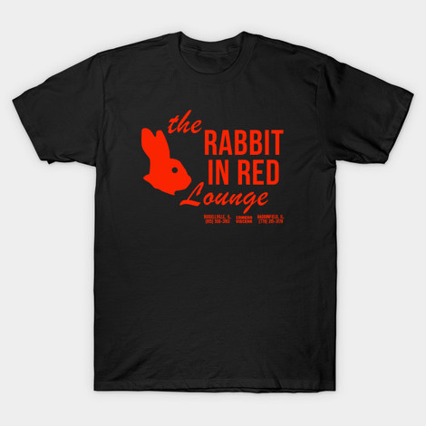 The Halloween soundtrack is surely in the jukebox at The Rabbit in Red Lounge. The fictional establishment is familiar to hardcore fans as being one of the places that Dr. Loomis (Donald Pleasence) identifies to help piece together Michael Myers whereabouts. He discovers the establishment's name on a matchbook that reads, "The Rabbit in Red Lounge - Entertainment Nightly." This Halloween movie t-shirt displays a stylish logo for the lounge. Also on sweatshirts.