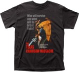 This bestselling Texas Chainsaw Massacre t-shirt displays the movie poster art, which includes an image of Leatherface (Gunnar Hansen) holding his chainsaw in front of him, along with the tagline, "Who will survive and what will be left of them?" The image conjures up memories of the final scene in the movie, when Leatherface raises the saw above his head after Sally Hardesty escapes in the back of a pickup truck. The image's distorted facial features reveal the Leatherface mask of human skin that is worn by the character.