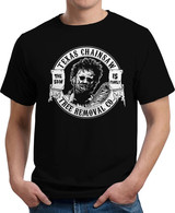 This unique Texas Chainsaw Massacre t-shirt features a logo for the Texas Chainsaw Tree Removal Company. Bubba Sawyer can be seen in the logo wearing his Leatherface mask. This print is available on numerous tee colors in both men's and women's styles. Also look for this design on Texas Chainsaw Massacre sweatshirt hoodies. Wrap this tee with Leatherface toys and action figures for the perfect TCM gift.