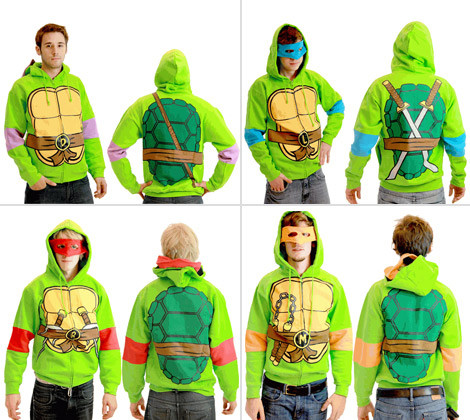 Description: You want to be a hero in a half shell? No problem. Like the Teenage Mutant Ninja Turtles costume shirt, these TMNT costume hoodies will make you one of the gang in no time. The TMNT t-shirt graphic encompasses the front and the back of the hoodie. Top it off with a reversible knit cap that is available below, along with Teenage Mutant Ninja Turtles masks and original movie figures. Like the tee, the cap's front and back design transforms you into a full fledged turtle. You and your friends can go as Leonardo, Raphael, Donatello and Michelangelo. Also check out the Shredder and Krang hoodies. Link to: TMNT Costume Hoodies