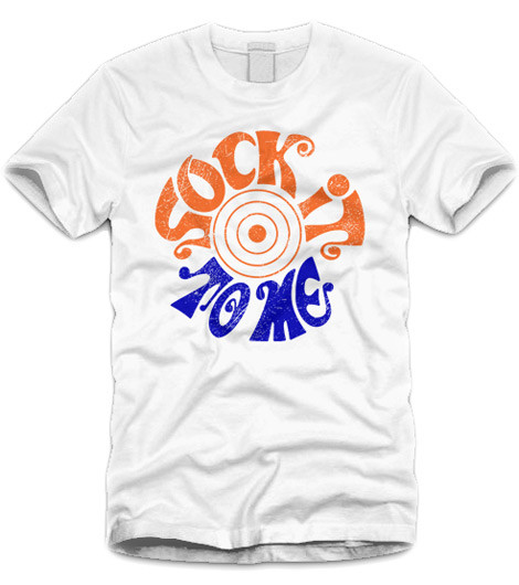 Description: This vintage Sock it to Me design is worn by Brad Pitt's character, Tyler Durden, in the Fight Club movie. The orange and blue retro style logo has a slightly worn look to give it a more rugged appearance. Whether you're in the mood for a stroll along Paper Street, or you plan on becoming a member of Tyler Durden's Project Mayhem, this Fight Club t-shirt will keep you in style no matter what you're doing. Tell your friends that your soap salesman friend Tyler lent it to you. Link to: Tyler's Sock it to Me Fight Club