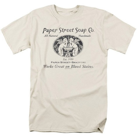 Description: This great Fight Club Soap Company t-shirt could pass for official company clothing. It features the logo for Tyler Durden's Paper Street Soap Company. Wear this tee and tell everyone that you sell "all natural, handmade" soap. If your customers are skeptical, you might point out that it works great on blood stains. Pick up this piece of merchandise to promote the company's soap, which is made from human fat. More colors available! Link to: Paper Street Soap Company