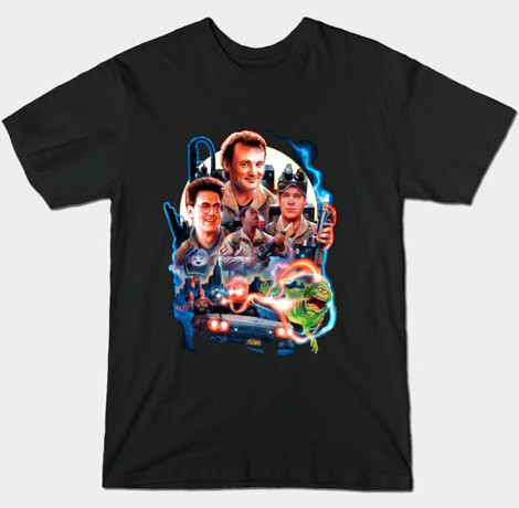 a gallery of Ghostbusters t-shirts and costumes, including the Ghostbusters Venkman t-shirt, Slimer tees, and the Ghostbusters logo shirt.