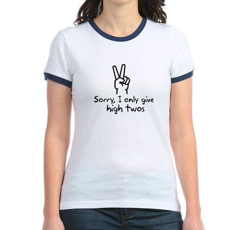 Description: The front of this tee features the Barney Stinson quote from How I Met Your Mother, "Sorry, I only give high twos." Barney delivers this line during the episode where he tells the story of his peace loving days working at the coffee shop with his ex-girlfriend Shannon. They were supposed to join the Peace Corps together, but Shannon breaks his heart; thus inspiring him to "suit up." The design on this How I Met Your Mother t-shirt also features a hand giving the "high two" sign, also known as the peace sign. Link to: Sorry, I only give high twos