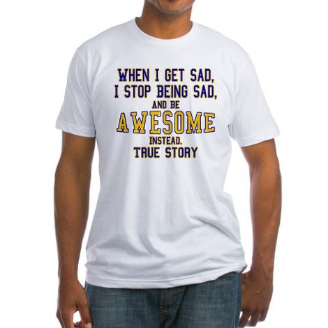 Description: This bestselling HIMYM tee features the classic Barney Stinson How I Met Your Mother quote, "When I'm sad, I stop being sad and be awesome instead." It ranks up there with other Barney quotes like, "Suit up because tonight will be legendary." Beside the quote are two depictions of a cloud, one with a sad face and one with an awesome face. Pair it with the Barney Stinson Suit Up design that is also available on a variety of merchandise styles, including ringer Ts. Wear the Suit Up t-shirt when you're feeling formal and this one when you're feeling awesome. Link to: When I'm Sad, I Stop Being Sad And Be Awesome Instead