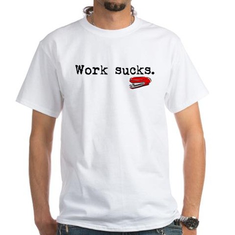 Description: Funny how such a short sentence of only two words can sum up an entire job. Yes, to state it simply, work sucks, especially when you're behind on your tps reports and your boss's name is Bill Lumbergh. This tee features typewriter style lettering along with Milton Waddams' stapler from the movie, which appears in red underneath. Don't blame us if your fellow employees start stealing your red Swingline stapler. Link to: Work Sucks Office Space